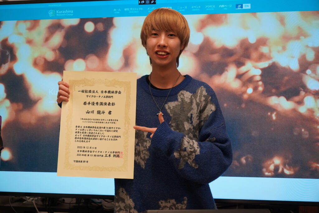 第14回マイクロ・ナノ工学シンポジウム 若手優秀講演表彰の受賞 2024 2/10 2024年2月10日 昨年の11月に開催されました日本機械学会主催『第14回マイクロ・ナノ工学シンポジウム』にて,M1 山川が若手優秀講演表彰を受賞いたしました.おめでとうございます! ソデバクワガタ すごい さいぼーくん 来年度もがんばるぞ…! Achievement News